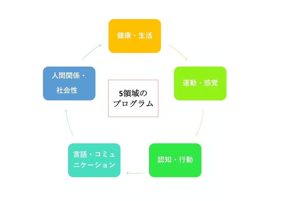 お子さまが毎日を楽しく過ごしながら、少しずつできることを増やしていけるように、5つの発達領域に基づいた支援を行っています。